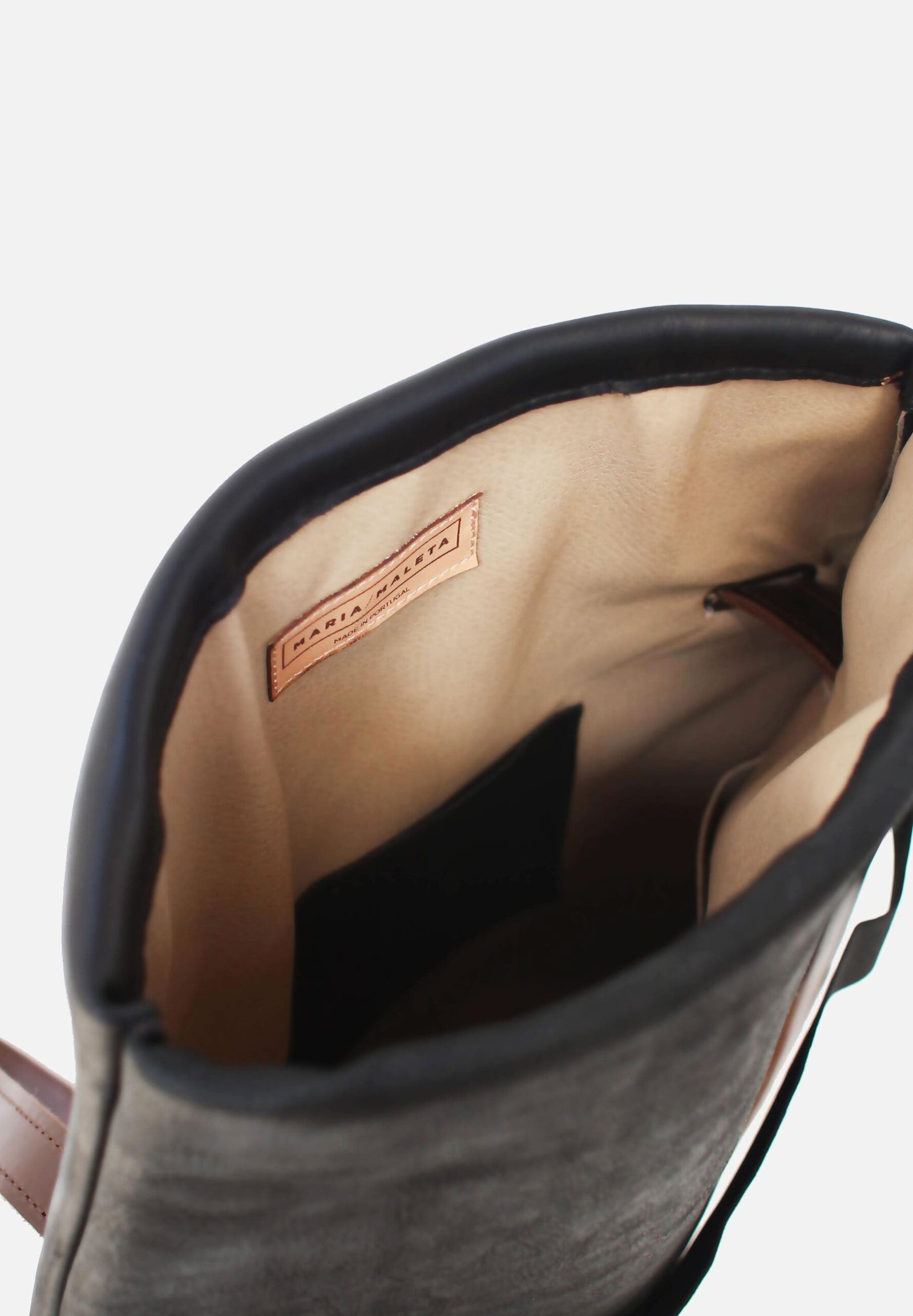 Backpack laptop bag in black leather. Black leather in one side. Back in black nubuck. Upcycled black elastic from the waste of polyester and cotton. and adjustable straps 70cm – 80cm. Two inner pockets. Dimensions: 35×33 cm. With an extra handle strap. REF. MMBPB Made in Portugal